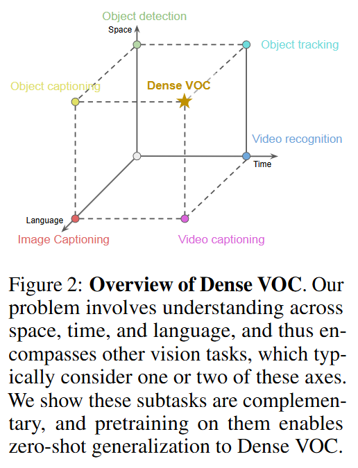 대규모 데이터셋과 대규모 모델의 등장으로 자연어는 현대 인공지능 모델에서 핵심적인 출력(output) 양식으로 떠오르고 있습니다. 언어는 다양한 작업의 출력을 공통적으로 표현할 수 있을뿐만 아니라 고정된 레이블에서 벗어나 더 다양하고 일반화된 형태로 나타낼 수 있어 zero-shot 연구에서 각광받고 있습니다. 이 경향은 vision-language 연구에서도 동일하게 나타나고 있습니다. image captioning, VQA, video captioning등 다양한 vision-language 연구에서 자연어를 활용하고 있습니다. 하지만, 저자는 이러한 연구들은 많았지만, unified vision-language 모델을 통해 모두 아우르는 연구는 거의 진행되지 않았습니다. 본 연구에서 저자가 제안하는 Dense VOC는 vision-language 모델을 어느정도 통합하는 연구로 객체 검출, 다중 객체 추적, 캡셔닝을 모두 수행합니다.
