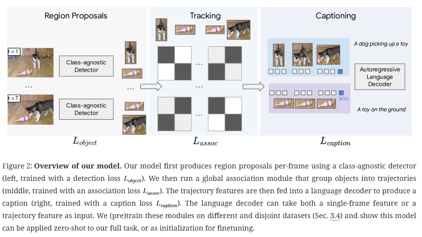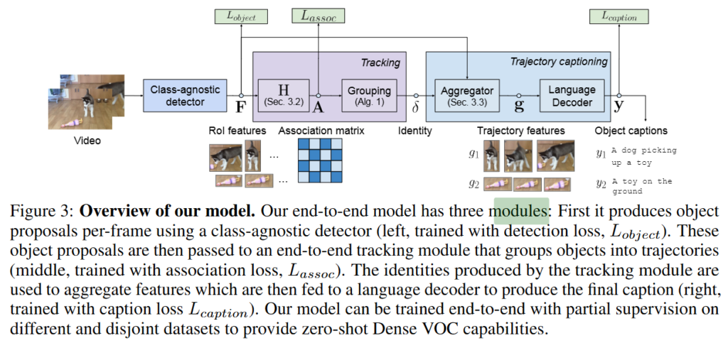 Figure 2.는 Dense VOC가 수행할 수 있는 여러 능력을 보여주고 있습니다. 주어진 비디오에서 모든 객체의 궤적을 찾고 각각의 적을 captioning을 통해 자연어로 설명합니다. 저자가 제안하는 모델은 end-to-end로 학습하며, 비디오의 매 프레임 객체 영역을 예측하고 후속 tracking 모듈을 통해 객체들을 추적합니다. 마지막으로 autoregressive 디코더를 활용한 trajectory captioning 모듈을 통해 객체 궤적들의 설명을 생성함으로 Dense VOC를 수행합니다.