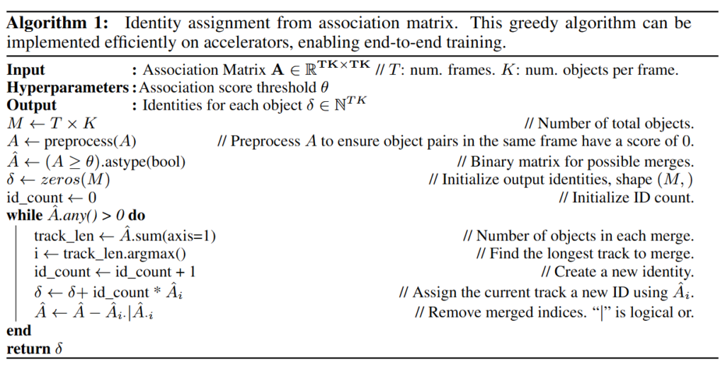 즉, 검출 손실로 학습된 class-agonistic detector를 통해 객체 후보 지역을 예측합니다. 이때 detector는 GRIT의 구조를 따릅니다. 그 후 검출 영역에 대해 같은 객체인지(궤적) 판별하여 ID를 부여합니다. ID를 부여하는 방식은 greedy 알고리즘을 사용하며 아래의 알고리즘입니다. 간단하게 설명드리면, 이진 행렬을 생성하고, 출력 ID를 초기화한 후에 가장 긴 궤적을 식별하고 ID를 부여합니다. 그 후 이미 할당된 객체를 제거 후 남은 객체 중 가장 긴 궤적을 다시 식별하고 ID를 부여합니다. 이진 행렬 내 값이 전부 없어지면 반복문을 종료하는 것으로 모든 궤적에 ID를 부여합니다.