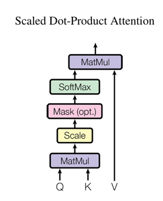 Query와 key의 차원은 dk, value의 차원 dv입니다. 아래 순서로 self-attention 연산이 진행됩니다.