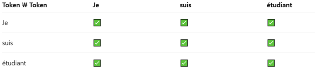 해당 표는 encoder와 decoder에서 각각 문장의 attention map을 만드는 방식입니다. encoder에서는 불어로 나는 학생이다의 attention map을 학습하고 이후 Decoder에 cross attention 형태로 넣어주게되며, decoder에서는 masked를 가중치값에 -inf 값으로 넣어 이후 softmax를 통과하면 0으로 계산되게끔 하여 구현하였습니다. sos는 문장의 시작점을 의미합니다.