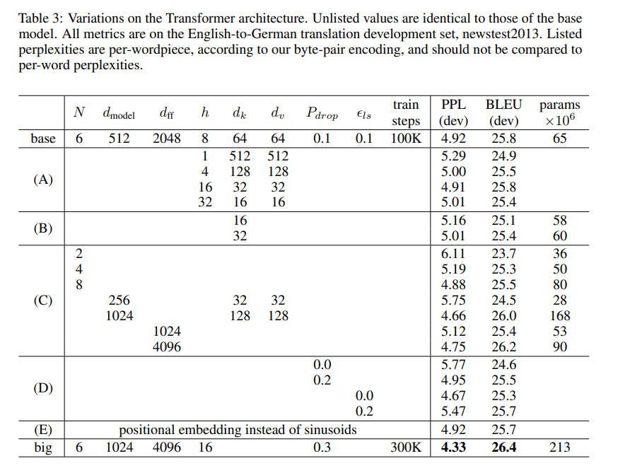base모델로부터 A , B , C , D , E 의 ablation을 진행하여 N이 커질수록 성능이 좋아지며 head 개수는 16개 이후부터는 성능감소, positional embedding은 성능적으로 base와 거의 유사한 점을 확인할 수 있습니다.