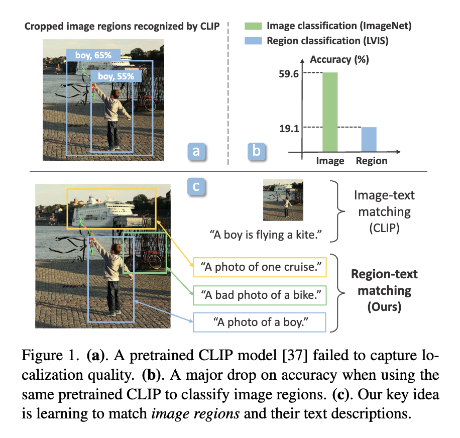 CLIP이 이미지 전체 단위로는 텍스트 매칭이 잘 작동하지만, 이미지 객체 영역에 대해서는 조금 부족하다라는 점을 보여주는 것 같고 (b)에서도 마찬가지로 그에 대한 내용을 표로 설명을 해주고 있습니다. 떠라서 (c)에서는 저자들이 제안하는 핵심 아이디어인 Region-Text Matching 방식을 간략하게 도식화하여, 이미지 전체 수준이 아닌 지역(region) 레벨에서 텍스트alignment를 잘 학습할 수 있도록 하는 방법론을 보여주는 것이라고 생각하면 좋을 것 같습니다.