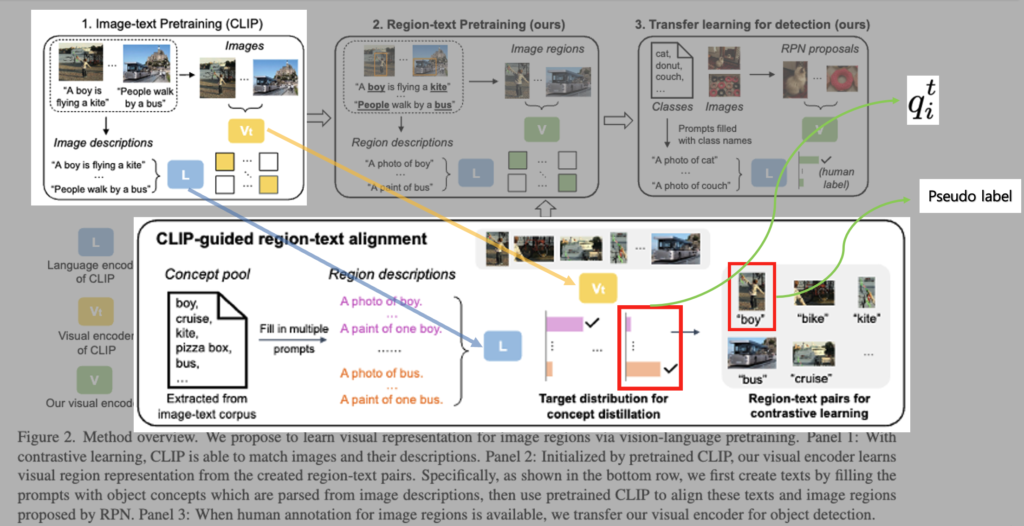 대부분의 이미지-텍스트 쌍에는 region-level에서의 설명이 존재하지 않기 때문에, 먼저 텍스트 코퍼스에서 파싱한 객체 concept(단어) 풀을 구성하고 이를 프롬프트에 삽입하여 region에 대한 설명을 생성해야합니다. 그러고 나서 잘 학습된 CLIP의 visual 인코더 Vt(노랑)를 활용하여 해당 프롬프트와 RPN이 제안한 이미지 영역 간 정렬을 수행하게 됩니다. 이렇게 얻어진 region-text 쌍과 distribution(q_i^t)을 수도 라벨, soft 라벨로 이용해 아래 그림과 같이