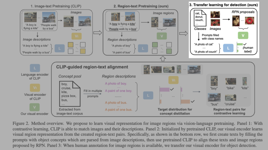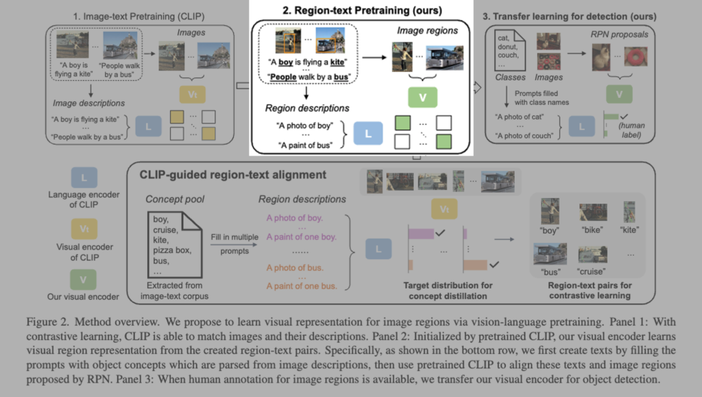 요약하자면 잘 사전학습된 이미지-텍스트 매칭 모델(CLIP)을 기반으로 하는 visual 인코더 Vt(노랑)와 language 인코더 L(파랑)을 가지고, 이미지 영역을 인코딩할 수 있는 새로운 visual 인코더 V(연두)를 사전 학습하여, 해당 영역 표현이 언어 인코더 L(파랑)로 인코딩된 영역 설명과 일치하도록 하는 방식이라고 생각하시면될 것 같습니다.