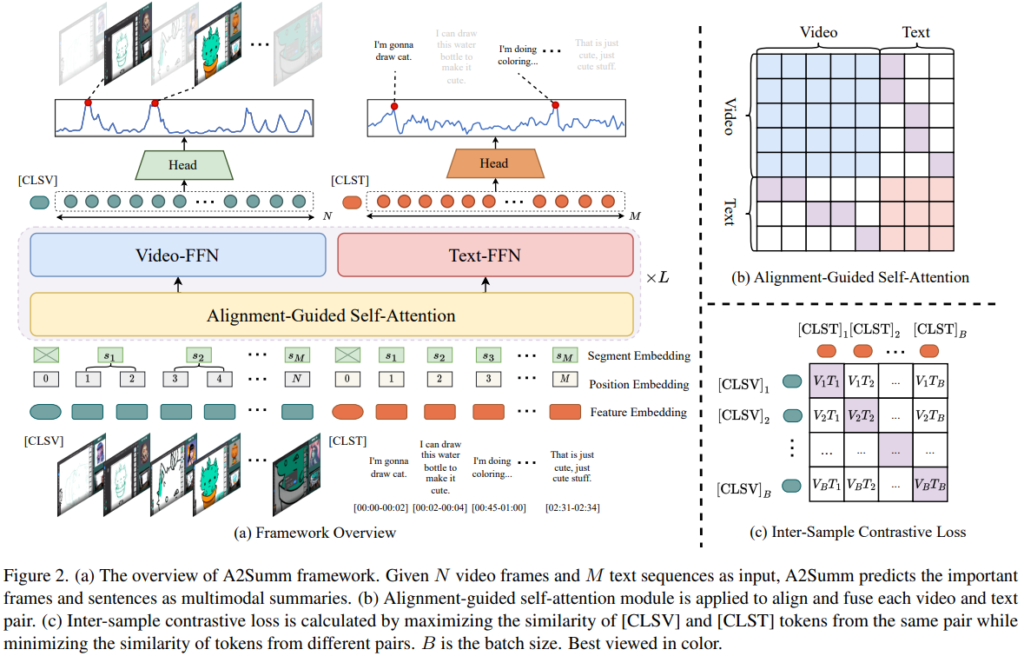 A2Summ에 대해 알아보기 위해 프레임워크 설명해보겠습니다. Figure2의 (a)가 A2Summ의 프레임워크 도식입니다. 해당 프레임워크의 입력은 2개의 모달리티로, N개의 프레임과 M개의 sentense 입력임을 확인할 수 있습니다. 가장 먼저 입력에 대한 임베딩 방법을 소개하겠습니다.