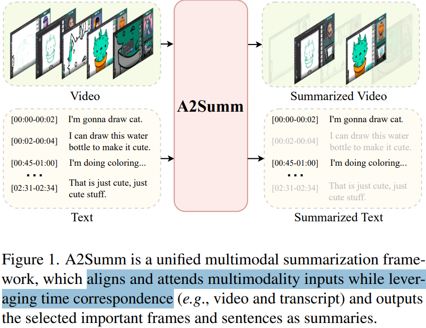 논문이 제시한 구조인 A2Summ의 입출력 구조는 Figure 1과 같습니다. 시간순으로 맵핑된 멀티모달 정보(영상, 텍스트)를 입력받고, 멀티모달의 동시적 이점과 맥락을 잘 활용해 중요한 시점의 프레임과 스크립트를 출력하는 것입니다. 구조적으로는 단순하고 특별할게 없다고 느껴질 수 있습니다. 그렇지만 기존 multi modal summarization 연구는 main modality summary만 생성했다고 했습니다. 즉, 비디오 요약 측면에서 텍스트를 활용하여 비디오(프레임)기준의 요약을 생성하거나, 텍스트 기준의 요약 생성에 있어 영상을 활용하는 것이 일반적이였습니다. 그러나 제안 방법은 Multimodal Summarization with multimodal output (MSMO) 연구라는 이점이 있습니다. Figure 1에서 알 수 있듯이 비디오와 텍스트에 대해 별도로 요약을 생성할 수 있는 것을 확인할 수 있습니다.