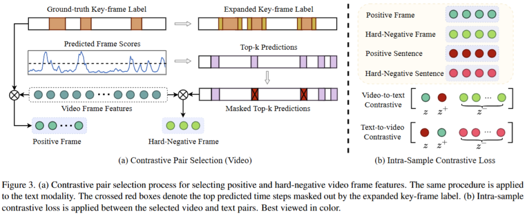 한편, 비디오의 내재적 정보의 응집성을 높이는 표현 추출을 위한 네트워크 설계를 위해서는 Intra-sample contrastive loss가 도입되었습니다. 이는 하나의 비디오에서 hard negative 시점과 positive 시점을 찾아 contrastive loss를 도입하는 방법입니다. positive pair는 GT를 통해 구성했으며, negative pair의 경우 아래의 Figure3(a)에서 확인할 수 있듯이 Predicted Frame Scores를 기준으로 중요도가 높다고 예측된 프레임 중, GT와 곂치지 않는 영역을 사용했습니다.