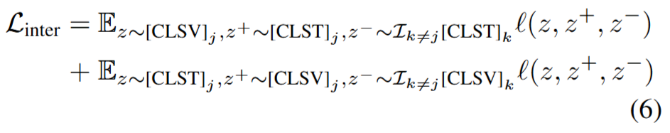 마지막으로, 컨텐츠의 내재적 정보를 잘 반영한 표현을 학습하기 위한 학습 목적함수를 추가적으로 설계하였습니다. 목적함수는 classification loss와 2 type의 contrastive loss(inter-sample contrastive loss와 intra-sample contrastive loss)의 결합으로 구성됩니다. classification loss는 t시점의 입력 프레임이 요약에 포함될지 여부를 분류하기 위한 기본적인 목적함수입니다. 본 논문의 제안한 설계는 그 다음인 dual contrastive loss에 해당합니다. 먼저 특정 비디오 샘플을 다른 비디오 샘플과 비교하여 구별력 있도록 네트워크 설계를 위한 목적함수인 Inter-sample contrastive loss는 Figure2(c)와 아래의 수식6을 참고하면 이해할 수 있습니다. 배치B내에서 j번째 비디오의 positive(z+)로 유사도가 높은 j번째 텍스트를, negative(z-)로는 pair가 아닌 feature로 하여 contrastive learning을 수행했습니다.