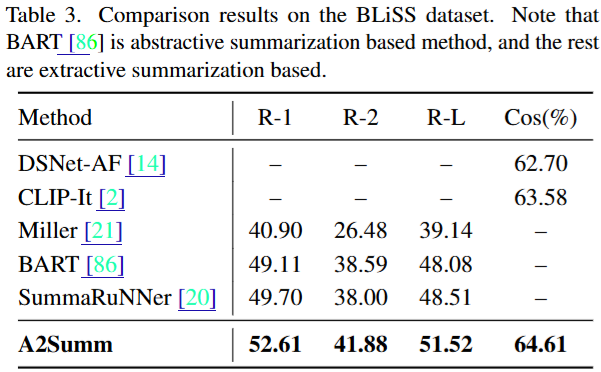 정리하면 논문은 A2Summ이라는 구조와 BLiSS 데이터셋을 공개했습니다. A2Summ을 통해 기존에 MIMO 연구에서 입력 데이터에 대해 시간적 동시성을 충분히 활용하지 못한 점을 개선하여 다양한 벤치마크(TVSum, SumMe, Daily Mail, CNN)에서 SOTA를 달성했으며, livestream 도메인을 위한 데이터셋을 구축했다는 점에 의미가 있습니다.