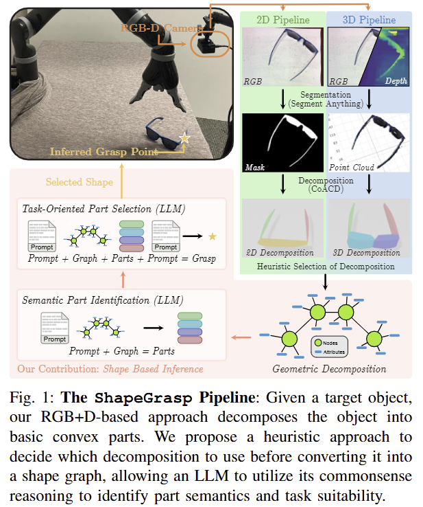 먼저, RGBD input I가 주어졌을 때, 저자가 제안하는 ShapeGrasp g, \theta = f_{SG}(I) 는 로봇이 객체를 들어 올리기(pick up) 위한 파지 위치 g와 방향 \theta 를 추정하는 것이 목적입니다. 해당 기법은 3 단계로 구성됩니다. 1) 타겟 객체를 분할하고 convex decomposition에 대한 검색(~간단한 도형으로 표현)을 수행합니다. 2) 그런 다음, automatic heuristic을 통해서 활용 가능한 분해요소를 선정하고, 3) 타겟 객체의 geometric composition을 추론하기 위해서 그래프 기반으로 표현하고, multi-stage reasoning을 위해 LLM을 적용합니다. 전반적인 흐름은 fig 1에서 확인 가능합니다.\