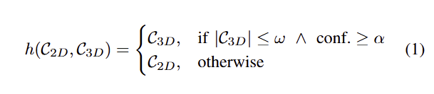 먼저, 낮은 decomposition threshold 초기 값 γ을 배치하고, 2D와 3D에서 하나의 부위가 나오도록 합니다. 그 다음에 만약에 3D decomposition C_3d의 수가 ω보다 많거나 depth의 high confidence가 α보다 낮으면 2D decomposition를 사용합니다. 이는 아래와 같이 정의 됩니다.