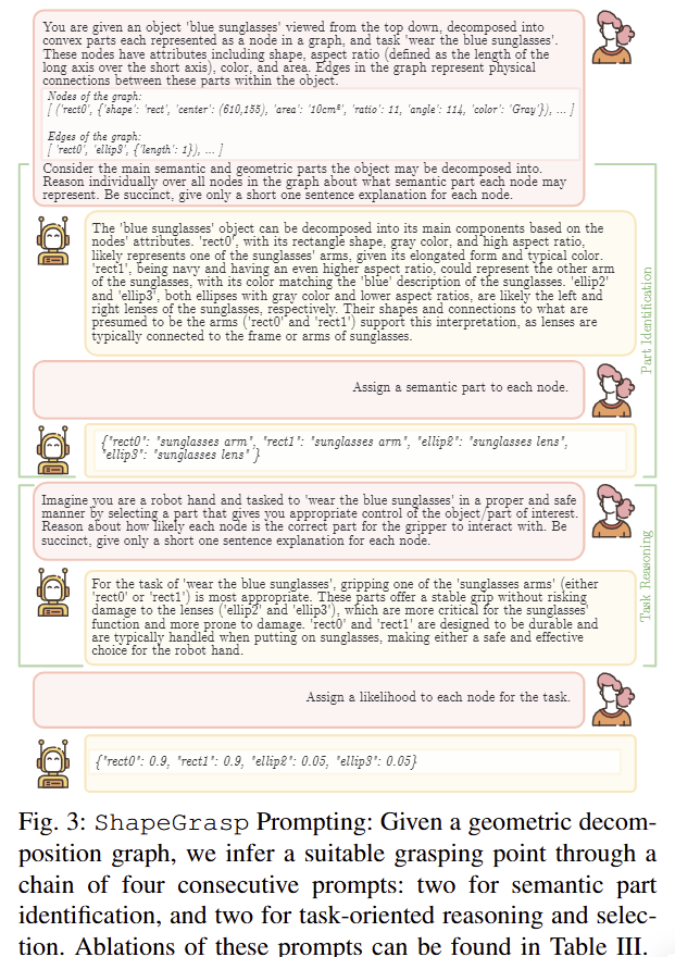 Grasp Inference through Shape Reasoning. 각 노드로부터 적절한 파지 지점을 선정하기 위해서 저자는 상식적인 추론이 가능한 LLM을 이용한 방법을 제시합니다. 이는 CoT에서 영감을 얻었으며, 보다 reasoning 능력을 향상 시키기 위해서 두 가지 상호 작용 단계로 구성됩니다. 각 단계는 1) graph g에 설명된 각 모양을 기반으로 의미론적 추론, 2) task-oriented grasp에 적절한 부위를 선택하는 방식으로 구성됩니다. 이를 위해서 저자는 fig 3과 같은 prompt template를 이용합니다. (TypeChat를 이용해서 prompt를 작성했다고 합니다. ~ openai api가 잘되어 있어서 딱히 필요 없음)