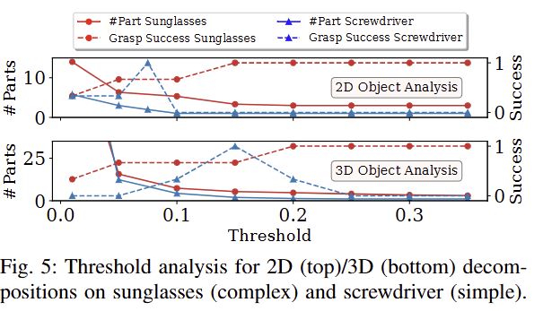 Dynamic Threshold Selection: 2D와 3D에 대한 분해에 있어 convex decomposition threshold γ는 굉장한 중요한 파라미터입니다. 해당 임계값이 높다면 (>0.2) 단순하게 분해가 되기 때문에 단순한 객체들은 실패할 확률이 올라갑니다. 반면에 낮다면 (< 0.1) 복잡한 객체들의 구성 요소들이 너무 많아져서 LLM이 reasoning을 수행하기 위해서 굉장히 복잡해지고, hallucination이 발생한 가능성이 높아집니다. fig 5는 sunglasses와 screwdriver에 대한 γ (0.01~0.35) 변화에 따른 Lifting success rate로 두 객체는 각각 복잡함과 단순한 객체로 보시면 됩니다. fig 5에서 보이는 바와 같이 객체의 복잡도에 따른 영향력이 다르기 때문에 2D는 γ=0.15, 3D는 γ=0.2로 설정하고 유효한 부위가 2개 이상 검출되지 않는 경우에는 0.025씩 낮추면서 반복적인 탐색을 수행하는 것을 제시합니다.