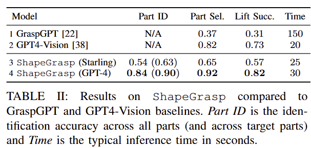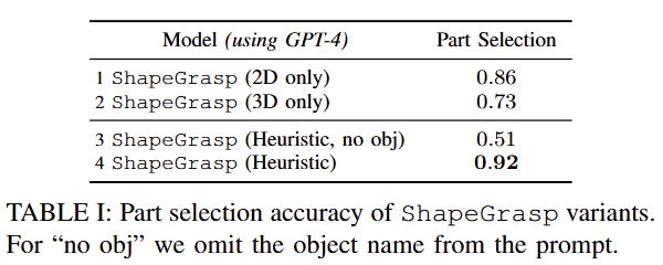 평가 방법: 다음 3가지 평가 방법을 사용 합니다. “Part Identification” (GT의 파트 부위 명칭을 잘 맞추는지) , “Part Selection” (태스크 측면에서 적절한 파트 부위를 잘 선별하는지), “Lift Success” (선정된 파트를 파지해서 잘 들어올리는가).