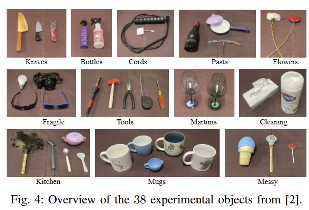 해당 실험에서는 fig 4와 같이 12가지 카테고리에서의 38개의 객체와 49 tasks에서 실험을 진행합니다. (LEFT-TOGO의 객체를 재사용했다고 합니다.) 각 실험에서는 3지 그리퍼를 가진 Kinova Jaco robotic arm을 이용하며, Oak-D SR passive stereo-depth camera를 이용하여 실험을 진행한다고 합니다.