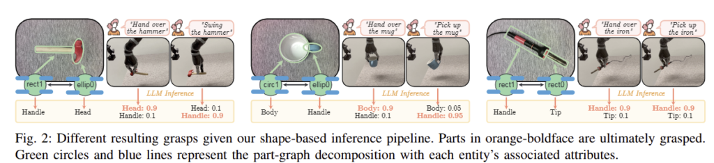 해당 방법론은 물체에 대하여 단순화된 형태들로 재구성한 뒤, 물체의 속성을 추출하여 object-graph를 만들고, 여기에 LLM을 적용하여 물체의 파지점을 찾는 방법론으로 이해하였습니다.