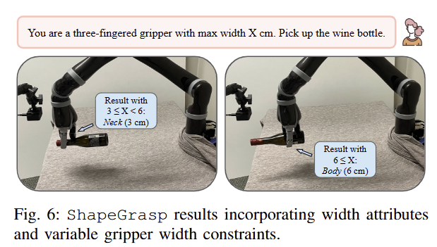 Qualitative Results: fig 2에서 지칭한 task에 맞게 객체를 처리하는 결과를 보여주며, 더 나아가 fig 6에서 그리퍼의 너비에 맞춰 파지를 수행하는 결과를 보여줍니다.
