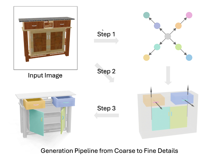 실내 환경에는 사실 articulated object들을 흔하게 발견할 수 있고, 로봇이 이들과 상호작용 하기 위해서는 시뮬레이션에서 활용할 수 있는 고품질의 3D asset이 필수적이라고 생각합니다. 다만 역시 이를 전문가가 일일이 제작하는 것은 비용적으로 매우 비효율적이고, 기존의 모델들은 사용자가 원하는 수준의 형태를 구현하기 어려운 구조이기 때문에 새로운 모델이 필요하다고 주장합니다. 따라서 저자들은 RGB 이미지 한 장으로 articulated object를 생성하는 문제를 설정하고, 닫힌 상태에서 가려진 부분들에 대한 모호성, 같은 카테고리 안에서도 다양하게 움직이는 관절들, 식별하기 힘든 작은 부품들을 구체적인 문제로 삼아 해결 방안을 제시했다고합니다. 기존 generative model들의 이점을 살리기 위해 generative model을 사용하되 VLM을 활용해 part connectivity graph를 추론하고, 이를 이미지와 함께 활용해 디퓨전 모델을 통해 부품의 바운딩 박스·라벨·관절 속성 등을 생성하고, 생성된 속성에 맞춰 파트 라이브러리에서 메시를 검색·조립해 최종 3D 객체를 완성한다고 합니다.