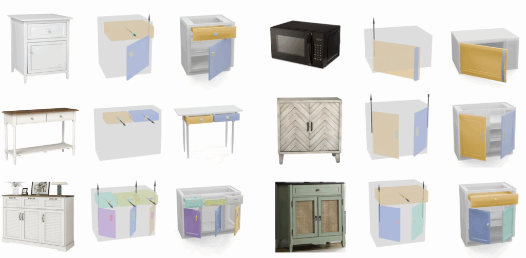마지막으로 각 part attribute vector에 대응하는 실제 mesh geometry를 선택하고, 이를 공간적으로 적절히 배치하여 전체 articulated object를 구성해줍니다. 이를 위해 SINGAPO는 PartNet-Mobility 및 ACD 데이터셋에서 미리 수집된 part-level mesh 라이브러리를 활용합니다.