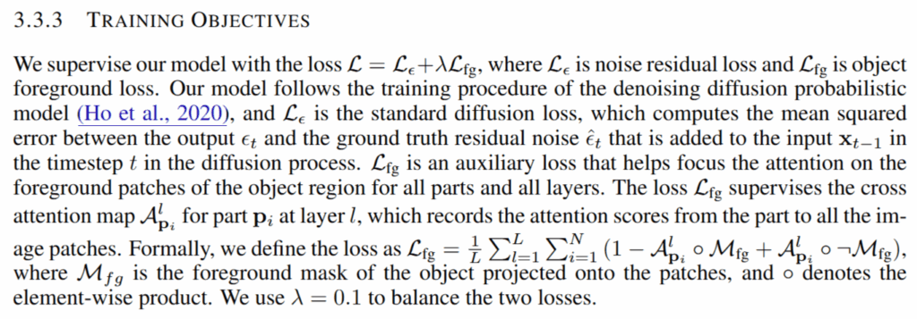 Loss는 기본적인 디퓨전 모델에서 사용하는 noise residual loss와 foreground mask와 attention score간의 일치도를 평가하는 loss로cross attention map이 이미지 내 객체의 foreground 영역에 집중하도록 도와줄 수 있는 구조를 가지고 있다고 합니다.