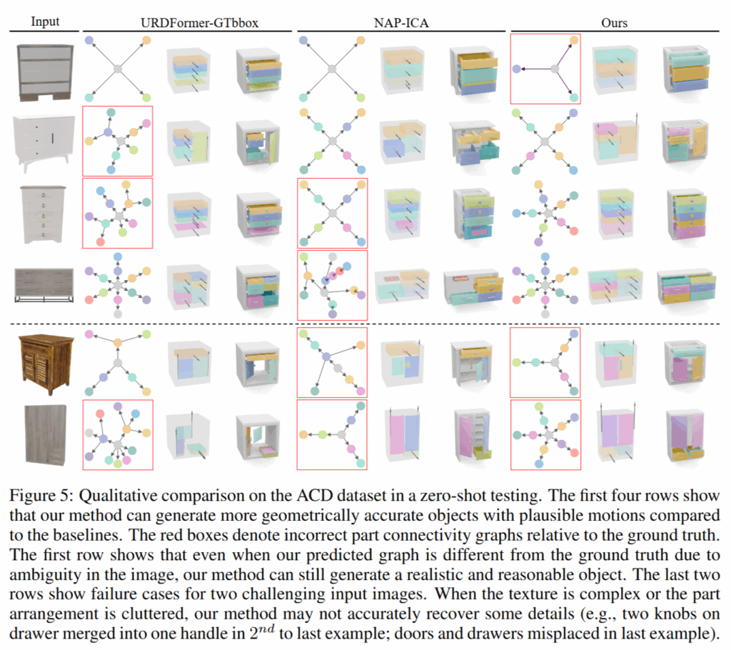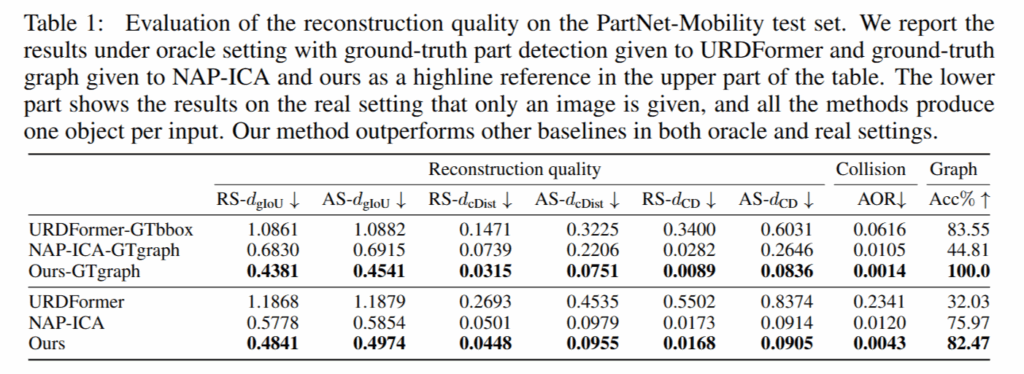 우선 PartNet-Mobility test set으로 URDFormer와 NAP-ICA와 비교했다고 합니다. URDFormer는 SINGAPO의 구조에서 diffusion 과정이 빠진 Transformer 구조만으로 part attributes를 생성하는 모델이고 NAP-ICA는 NAP 프레임워크에 image cross-attention 모듈(ICA)을 붙인 baseline이라고 합니다.