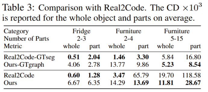 또한 공정한 비교를 위해 Real2Code 논문에서 제시한 evaluation protocol을 그대로 따랐다고 합니다. Table 3에서 확인할 수 있듯이, SINGAPO는 부품 수가 많고 구조가 복잡한 객체에 대해서 더 뛰어난 reconstruction 성능을 기록했다고 합니다.