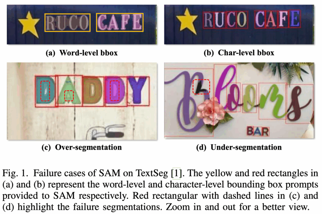 위 Fig1의 (a)와 같이 SAM에 word-level의 bbox를 입력으로 주면, 개별 text를 구분하기보다는 전체 word를 하나의 덩어리로 처리해버리는 것을 확인할 수 있습니다. 즉, 정확하게 text를 segmentation하지 못하고 있죠. (b)의 word-level이 아니라 character-level로 prompt를 넣은 결과를 보아 SAM에는 character-level의 bbox가 필요하다는 것을 확인할 수 있습니다.