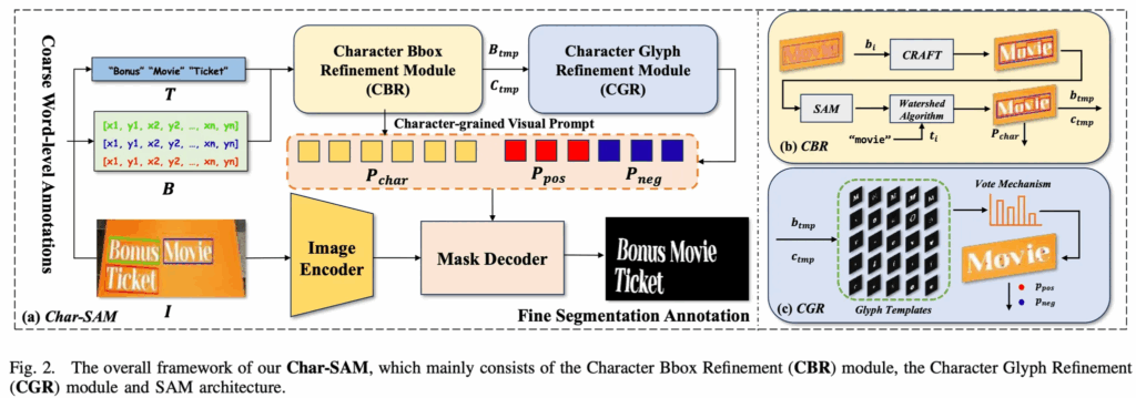 Char-SAM은 scene 이미지에 주어지는 word-level annotation을 pixel-level annotation으로 refine하는 것이 목표입니다. 전체 프레임워크는 위 Fig2에서 확인해볼 수 있는데 처음에 입력으로는 Image와 word-level bounding box B =