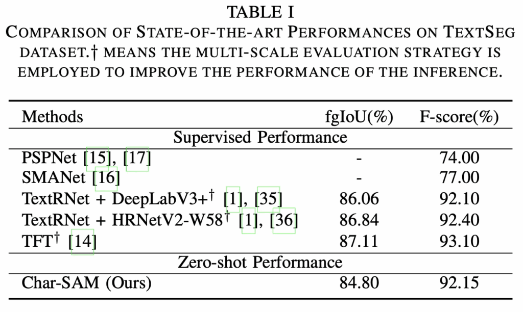 먼저 벤치마크 table인데 여기서는 TextSeg 데이터셋에 대해서만 수행되었습니다. 위 Table1 결과를 보시면 Char-SAM은 학습 없이 동작하는 방식이며, single scale input resolution만 사용했음에도 multi-scale을 사용한 supervised 모델과 유사 성능을 보입니다. (dagger 표시가 multi scale). 특히 F-score 측면에서 보면 기존 SOTA인 TFT보다 약 1% 떨어지는 성능을 보이고 있습니다. 이는 Char-SAM이 학습 없이도 scene text segmentation을 위한 auto augmentation pipeline임을 보이는 실험이지만,,, 베이스로 삼은 SAM모델에 대한 리포팅이 되어 있지 않아 본 테이블에서 SAM과의 비교는 어려운 점이 아쉬운 것 같습니다.