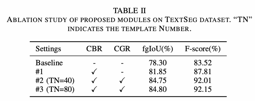 다음은 ablation study로 우선 본 논문에서 제안된 두 모듈, CBR과 CGR 모듈의 효과를 확인하고자 수행된 실험입니다. 먼저 baseline과 비교했을 때 CGR 모듈만 추가한 경우 두 평가지표에서 3%이상의 성능 향상을 보여주면서 word-level의 bbox를 그대로 사용하는 것보다는 character-level의 bbox로 정제해서 사용하는 과정이 실제로 segementation을 수행하는데 더 도움이 된다는 점을 보이고 있습니다. 또 #1과 #2(CGR을 함께 사용하는 경우)를 비교해보면 CGR 모듈은 glyph 정보를 기반으로 좀 더 정교한 visual prompt를 생성해서 fgIoU 기준 약 3%, F-score 기준 약 4% 더 성능 향상을 가져온 것을 확인할 수 있습니다. 또 #2, #3은 두 모듈을 다 사용하는 경우에서 TN 차이가 존재하는데, 이는 glyph 템플릿에 사용한 폰트 수를 의미합니다. 즉, 폰트 수를 40개 사용하는 것보다 80개로 늘려 사용하면(#3) 미세하긴 하지만,, 성능이 좀 더 향상된 것을 확인할 수 있는데 이는 폰트가 다양할수록 문자의 구조를 보다 정확하게 모델링하는 데 도움된다고 해석해볼 수 있겠습니다.