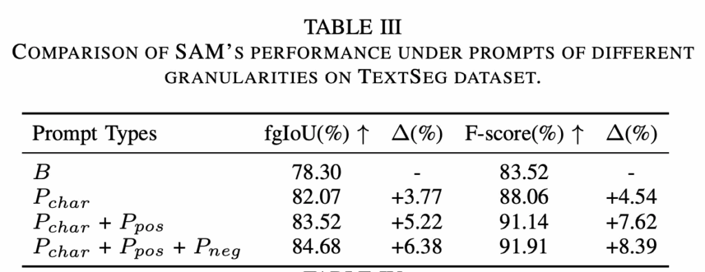 다음은 prompt를 좀 더 세분화하는 것이 segmentation 성능에 미치는 영향을 확인하는 실험입니다. 위 Table3에서 확인할 수 있듯이 맨 위에 있는 B는 word-level의 bbox만을 사용하는 경우인데, 이보다는 그 아래 P_{char} character-level box를 사용하는 경우 앞서 table2에서 본 것 과 같이 성능 향상을 보이고 있습니다만, 표2의 #1과 동일한 실험이라고 생각되는데 성능이 다른 점에 대해서는 언급이 없는 점이 수상합니다. 이후, 이 character level box에 더해서 positive point prompt를 함께 사용할 경우에 base 대비 추가적인 성능 향상을 보이고 여기에 negative point prompt까지 사용하면 약간의 성능 향상을 더 보이는 것을 확인할 수 있습니다. 다만 이 역시 table2의 #2혹은 #3과 유사 실험이라고 보이는데 성능이 미세하게 다릅니다.