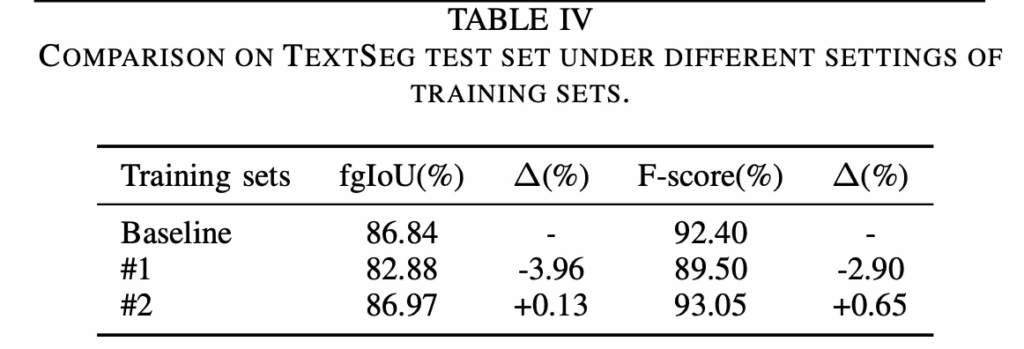 이전까지는 TextSeg데이터셋을 사용해 실험을 수행했는데요. 이 TextSeg 데이터셋은 pixel level의 mask가 다 들어있는 데이터셋이지만, COCO_TS, MLT_S 데이터셋은 각각 COCO-Text와 MLT17이라고 하는 데이터셋으로부터 weakly supervised 방식을 통해 생성된 좀 quality가 낮은 annotation입니다. 이 실험은 본 논문에서 제안된 프레임워크 Char-SAM으로 생성한 text segmentation annotation이 기존 semi-supervised 방식으로 만든 COCO TS나 MLT S보다 더 좋은 quality를 갖는 다는 점을 입증하고자 수행되었습니다.