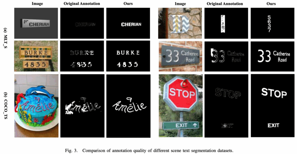 마지막으로 시각화 결과입니다. 위 Fig3은 Char-SAM으로 생성한 pixel level annotation과 기존 COCO TS, MLT S annotation을 비교하고 있는데. 보시면 육안으로 보기에도 Char-SAM이 생성한 mask는 전체적으로 text 경계가 좀 부드럽다구 볼 수 있고, foreground와 background 간의 구분도 명확합니다.
