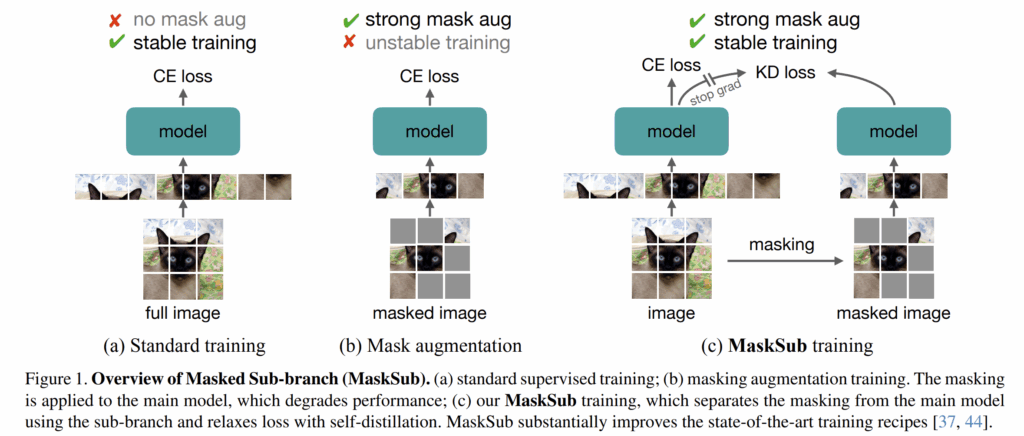 그래서 저자들은 지도학습에서 50%가 넘는 수준의 mask augmentation을 적용하여서 모델의 성능을 높이는 것을 논문의 목적으로 설정합니다. 그 결과 저자들은 main branch와 별개로 sub-branch를 나누어 해당 branch에서 mask augmentation과 관련된 학습 과정을 거치는 새로운 framework을 제안하였다고 하죠 (이를 MaskSub라고 저자들은 명칭합니다.)
