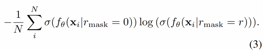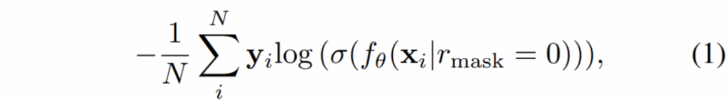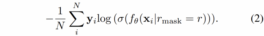 여기서 시그마 함수는 softmax를 의미하고 f_{\theta} 는 백본을 포함한 분류 모델을 의미합니다. 그리고 입력에 마스킹이 되어있다는 것을 함께 표현하고 있는데 r_{mask} 의 값이 0인 경우는 마스크 비율이 0%로 마스킹이 전혀 안된다는 것을 의미한다고 보시면 됩니다.