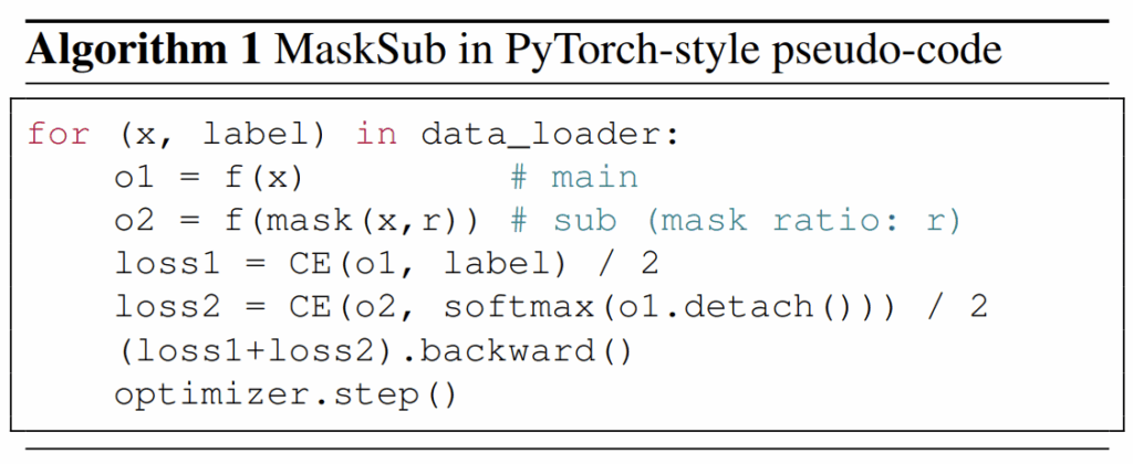 그리고 수식 3에서 마스킹이 0인 입력을 토대로 만들어낸 soft-label에는 stop gradient를 설정하여서 하나의 pseudo label로써의 역할을 수행하도록 하였습니다. 즉 sub-branch는 main-branch를 모방하는 형식으로 모델을 학습하고, 메인 브랜치는 sub-branch의 결과와는 별개로 독립적인 지도학습을 하는 방향으로 진행이 되는 것이죠. 아래는 위에 설명에 대한 수도코드를 나타낸 것으로 매우 직관적이면서 단순하다는 것을 알 수 있습니다.