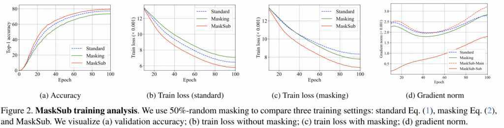 그림2의 d 같은 경우는 메인 브랜치와 서브 브랜치 사이에 학습 패턴을 확인하고자 나타낸 그래프라고 합니다. 우선 메인브랜치에 대한 기울기 크기 값(즉 MaskSub-Main)이 다른 학습 기법(Standard, Masking)과 유사한 형태와 크기 값을 가지고 있는 반면에, 서브 브랜치에 대한 기울기는 초기 학습 단계에서 작은 값을 가지고 있는 모습입니다.