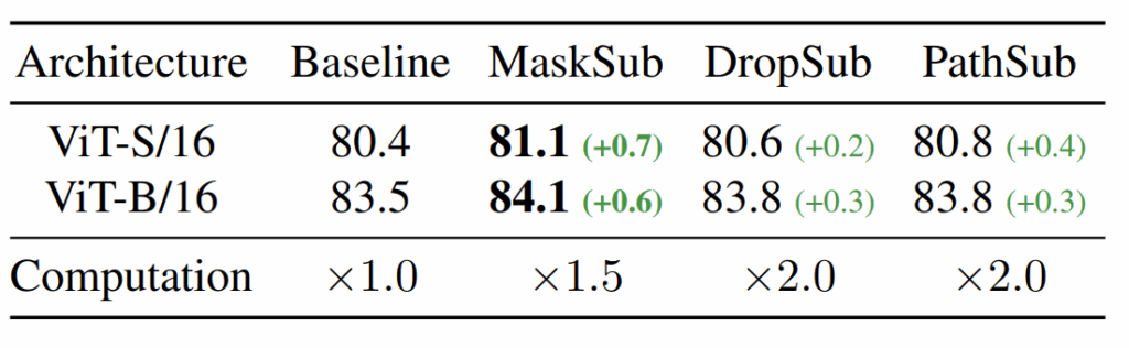 여기까지만 하고 넘어가면 논문이 다루는 내용이 너무 단순해서인지 저자들은 MaskSub와 유사하게 DropSub와 PathSub라는 framework도 함께 만들어서 실험을 진행합니다. 쉽게 말해서 마스킹이라는 과정이 입력 데이터에 정보를 모델이 못보도록 하는 것이고, dropout과 droppath는 모델의 일부분을 forward 과정에서 사용하지 않는 것이니 마치 입력을 가릴래 모델을 가릴래?와 같은 느낌으로 볼 수 있는 것이죠.