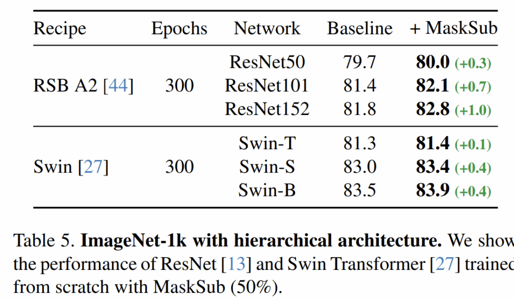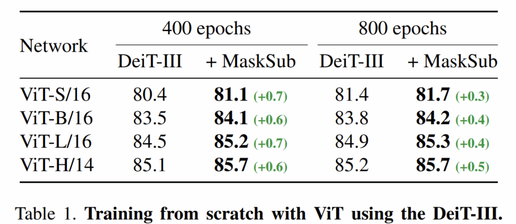 다음은 scratch 레벨에서부터 학습하였을 때의 성능을 나타낸 것으로, DeiT-3 방식으로 학습한 receipe에 자신들의 masksub framework을 적용하였을 떄의 성능 향상을 보여줍니다.