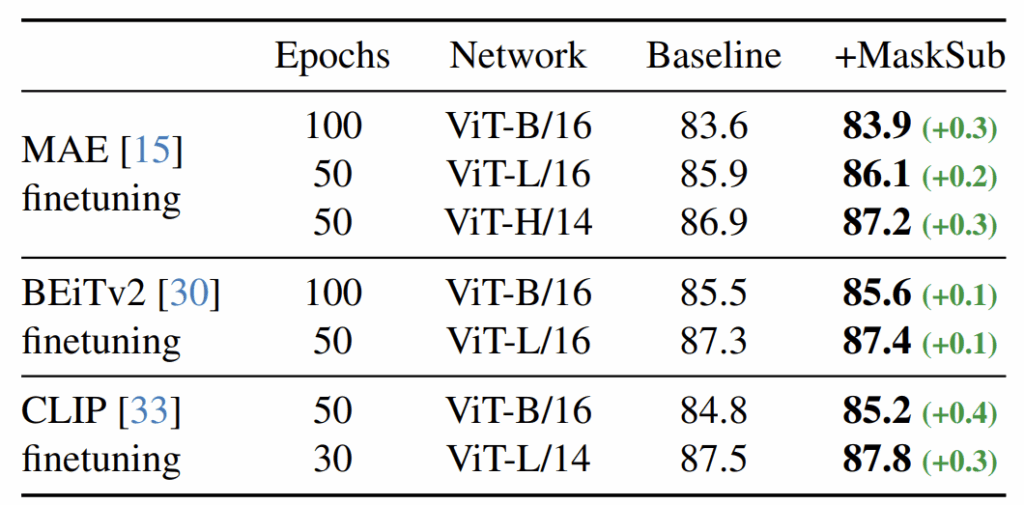 저자들은 Deit3를 400에포크로 학습시켰으며, masking의 경우 비율이 50%, dropout은 0.2, drop-path는 baseline이 사용한 기본 값에 +0.1 추가하여 학습시켰다고 합니다. 결과적으로 모든 Sub 방법론들이 베이스라인보다 더 좋은 성능을 보여준 것은 맞다고 합니다. 그치만 그 중에서도 저자들이 메인으로 끌고 나가는 MaskSub가 가장 좋은 성능을 보여주었다는 점이며, 또한 MAE에서 제안하는 연산 과정을 채택했기 때문에 학습에 사용하는 코스트 역시 다른 Sub들보다 더 효율적이라고 하네요.