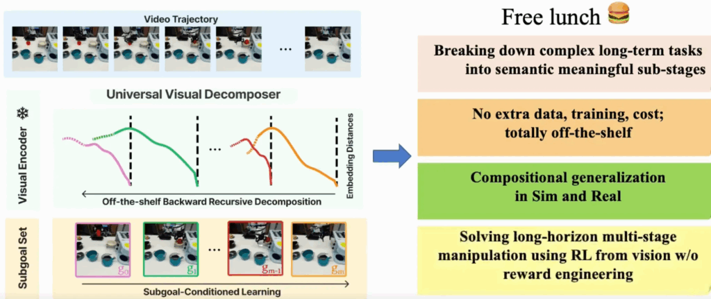 결국은 unsegmented 작업 비디오 demonstration 안에 내재된 sub-task들을 식별할 수 있는 시각적 작업 진행 자체에 대한 일반적인 지식이 필요합니다. 본 논문에서는 이를 Universal Visual Decomposer(UVD)라고 제안합니다. 즉 논문의 표현을 빌리면, 비디오 input이 들어왔을 때 사전학습된 sota급의 어떤 visual encoder로부터 임베딩된 시각적 표현을 재활용해서, 자동화된 task segmentation을 수행하는 off-the-shelf unsupervised subgoal decomposition 방법론이라고 할 수 있습니다. 저자들의 project page에선 이를 free lunch라고도 표현하고 있네요.