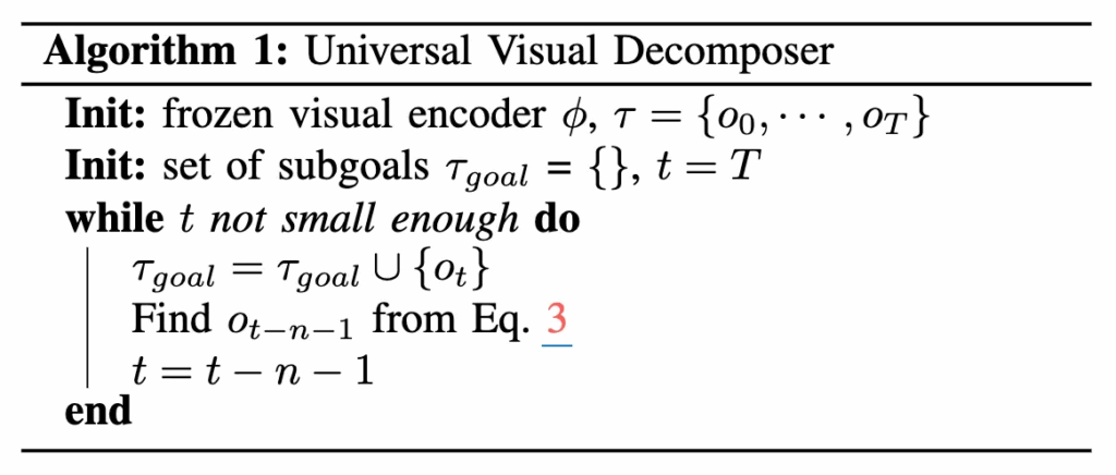 먼저 질문(1)은 데모에서 마지막 프레임 $o_T$가 자연스럽게 goal이 된다는 점을 관찰함으로써 간단히 해결할 수 있죠. 이제, subgoal $o_t$를 조건으로 하여, $o_t$로의 시각적 task progress 변화를 묘사하는 프레임의 하위 시퀀스에서 첫 번째 프레임 $o_{t-n}$을 추출하려고 시도합니다. 이 첫 번째 프레임을 발견하기 위해, 저자들은 로봇 제어를 위한 여러 sota pretrained visual representation(LIV[ICML 23’, Meta], Vip[ICLR 23’ SpotLight, Meta], R3m[CoRL 23’, Meta])이 단일 해결된 작업을 묘사하는 짧은 비디오 내에서 temporal progress를 포착할 수 있도록 사전학습되었단 사실을 활용합니다. 이러한 representation은 짧은 goal-reaching 비디오 시퀀스 $\tau = (o_{t-n}, …, o_t)$에 걸쳐 monotonicity(단조로운 추세)를 보이는 임베딩 거리를 효과적으로 생성할 수 있습니다. $\qquad d_\phi(o_s; o_t) \geq d_\phi(o_{s+1}; o_t), \forall s \in \{t – n, …, t – 1\}, \qquad (2)$ 여기서 $d_\phi$는 $\phi$-representation 공간에서의 거리인데. 본 연구에선 L2 distance 즉 $d_\phi(o; o’) := \Vert \phi(o) – \phi(o’) \Vert_2$로 설정합니다. 이는 여러 사전학습된 표현이 학습을 위한 임베딩 메트릭으로 L2 distance를 사용하기 때문이라고 합니다. 이를 감안하여, 이 monotonicity(단조성)라는 조건이 실패하는 $o_t$에 대해 시간상 가장 가까운 관찰을 이전의 subgoal로 설정하게 됩니다. $\qquad o_{t-n-1} := \text{arg max}{o_h} d\phi(o_h; o_t) < d_\phi(o_{h+1}; o_t), h < t. \qquad (3)$