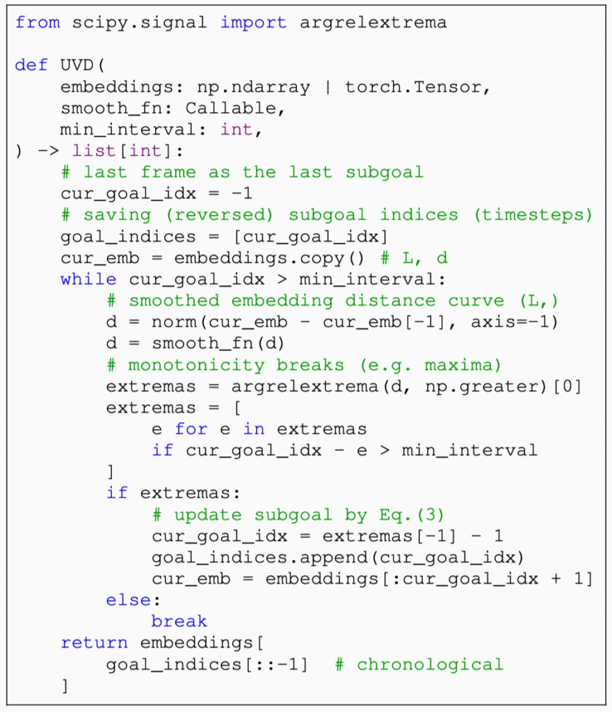 본 논문에서 정의하는 UVD 알고리즘 기반의 subgoal 찾기는 video 관점에서 visual적인 임베딩 distance의 ‘단조성’이 깨지는 지점을 subgoal 지점으로 잡는다는 것이 핵심입니다.