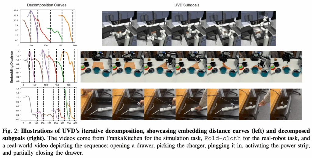 Fig. 2에서는 UVD의 반복적인 분해 과정을 시각화하여 임베딩 거리 곡선(왼쪽)과 그 결과로 분해된 subgoal(오른쪽)을 보여줍니다. 시뮬레이션 작업은 FrankaKitchen에서, 실제 로봇 작업은 Fold-cloth 세팅에서 이뤄집니다. 동작의 경우에는 서랍 열기, 충전기 집기, 플러그 꽂기, 전원 스트립 켜기 및 서랍 닫기를 보이는데요. 왼쪽 임베딩 거리 시각화에서 검은색 점선은 UVD가 단조 감소가 깨지는 시점을 식별하는 시점을 나타내며, 앞서 언급한 최소 간격을 고려합니다.