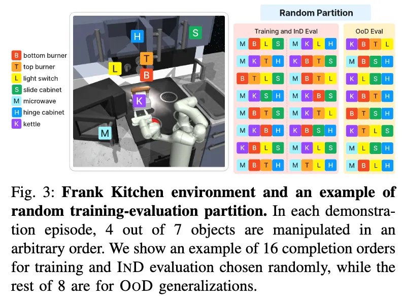 시뮬레이션 실험을 위해 FrankaKitchen 환경을 사용합니다. 빨주노초~ 로 표시된 총 7가지 객체들과 상호작용할 수 있고, 저자들은 해당 환경이 데이터셋을 정제해서 successful trajectories만 포함시키면서 총 513개의 에피소드를 만들었고, 해당 모든 에피소드들은 VR헤드셋 기반 teleoperation으로 수집되었다고 합니다. 각 에피소드에서 7개 객체 중 임의 선택된 4개의 객체가 임의 순서로 섞이면서 아래와 같은 training, InD eval, OoD eval을 구성하게 됩니다.
