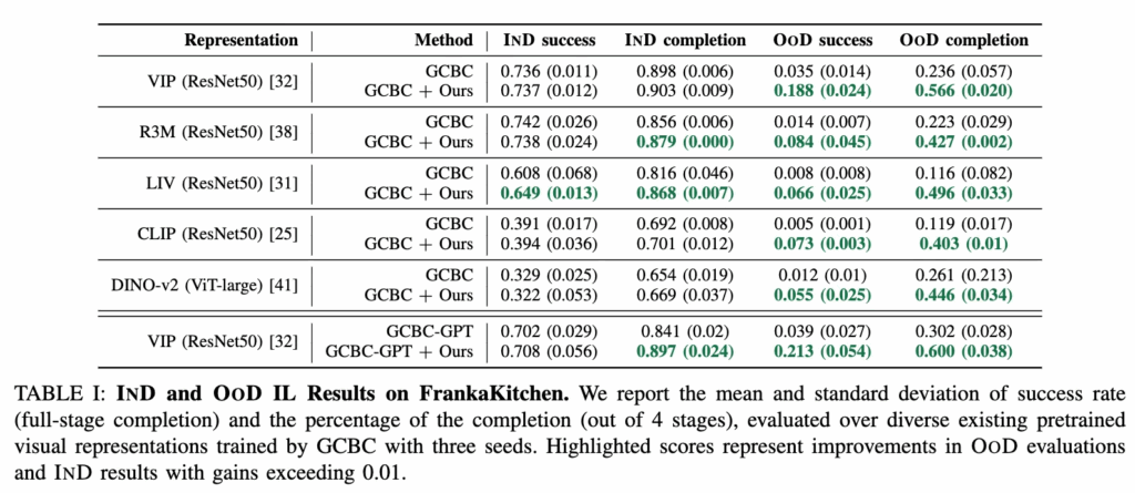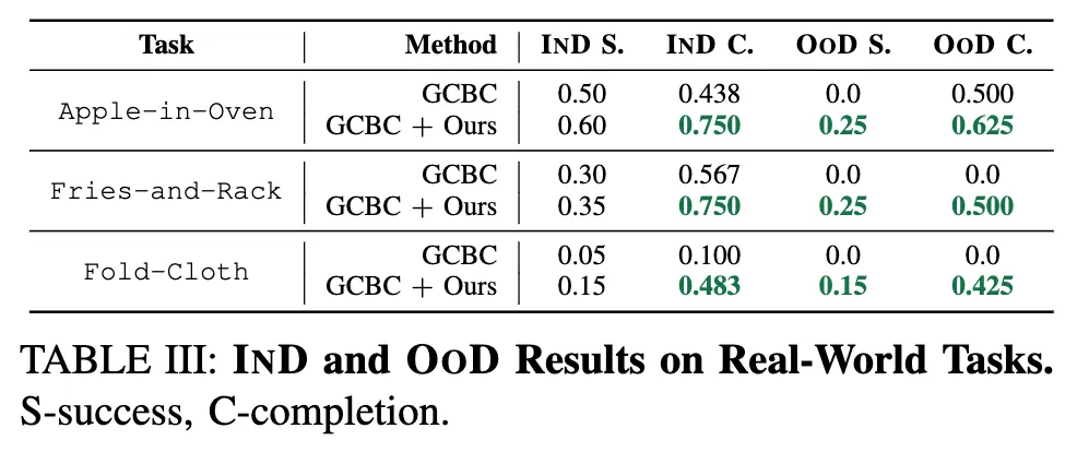 아까 Fig3을 참고하면, n개의 객체 시퀀스 조합으로 IND 평가를 통해 학습하고, 나머지 24 – n개의 작업 시퀀스는 보이지 않는 OOD 시나리오 평가를 위해 남겨둔다고 합니다. 기본적으로 n = 16을 사용하며, 공정한 비교를 위해, 모든 실행 세트에 대해 3개의 고유한 사전 정의된 시드에 의해 생성된 동일한 3개의 무작위 seen-unseen 분류를 사용한다고 합니다. 정책 성능 평가는 전체 작업의 성공률(success rate)과 완료된 하위 작업 수(completion)이고, 평균, 표준표차로 표현됩니다.
