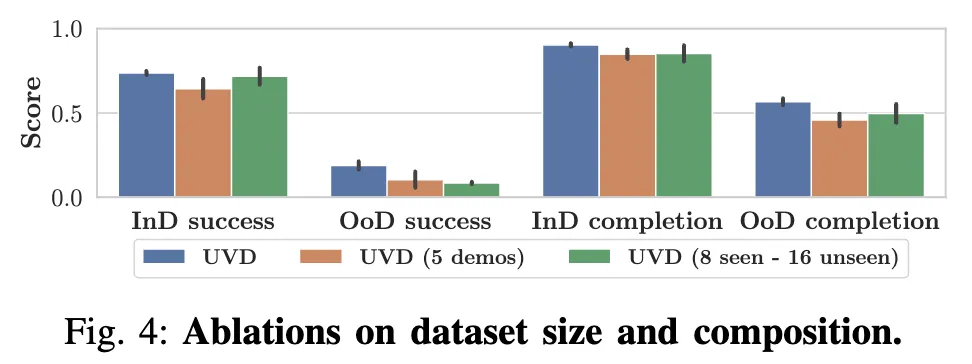 - 여러 시뮬레이션 및 실제 로봇 작업에서 InD(In Domain), OoD(Out of Domain) 평가에서 정책의 성능을 개선하는 데 있어 UVD 효과 입증.
