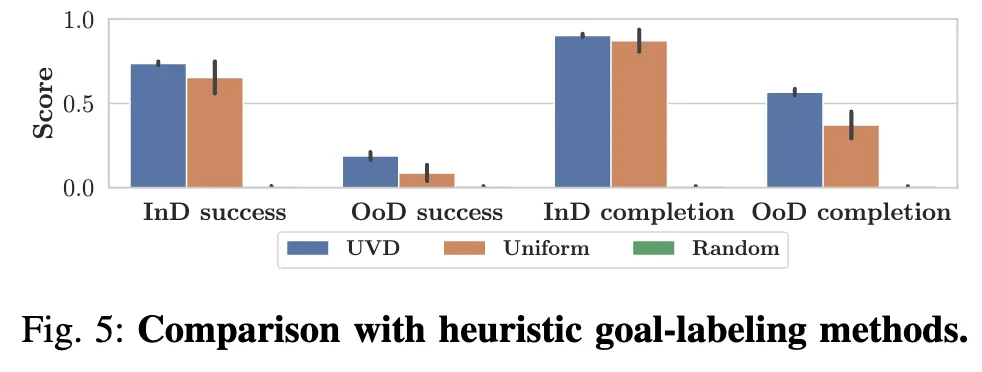마지막으로, UVD가 강력한 OOD 일반화를 달성하는 데 대안이 될만한 subgoal 생성 방법 비교로, Uniform과 Random 방식에 대한 비교 ablation study입니다. Uniform 방식은 관찰 후 고정된 크기의 window 내에서 프레임을 무작위로 선택합니다. Random은 demonstration 내에서 3~5개의 프레임을 subgoal 프레임으로 무작위로 선택합니다. 그림 5에서 볼 수 있듯이, 이러한 대안들은 모든 설정 및 지표에서 성능을 저하시켰는데, 이러한 대안들은 중복되고 의미적으로 덜 중요한 subgoal들을 도입하기 때문이라고 합니다. 결과적으로, 이들은 IND에서는 비슷하게 수행될 수 있지만, OOD 일반화는 저하되는 모습을 보였습니다.