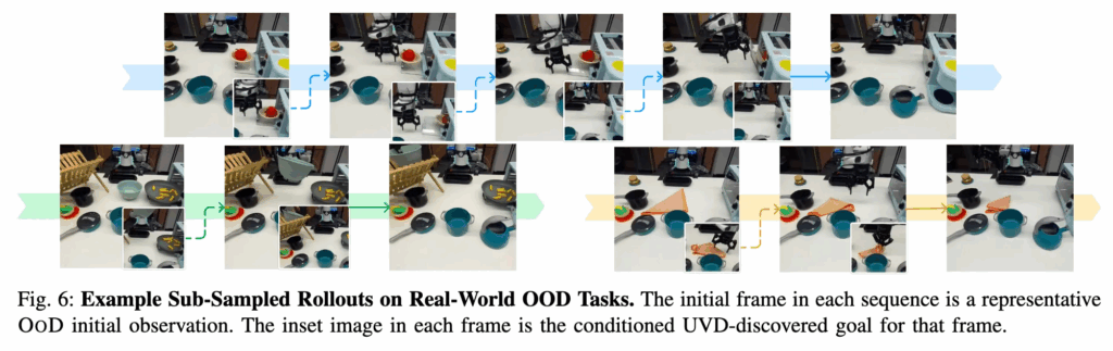 마지막으로, Figure 6은 OOD 작업에서의 UVD 정책 실행 결과에 대한 시각화입니다. 샘플링된 프레임들과 해당 프레임의 조건 하위 목표(inset frame)를 함께 보여줍니다. 모든 경우에서, UVD는 훈련 데이터에서 의미 있는 하위 목표를 회수하고, 정책은 이 하위 목표가 표현하는 semantic subtask를 성공적으로 수행했습니다.